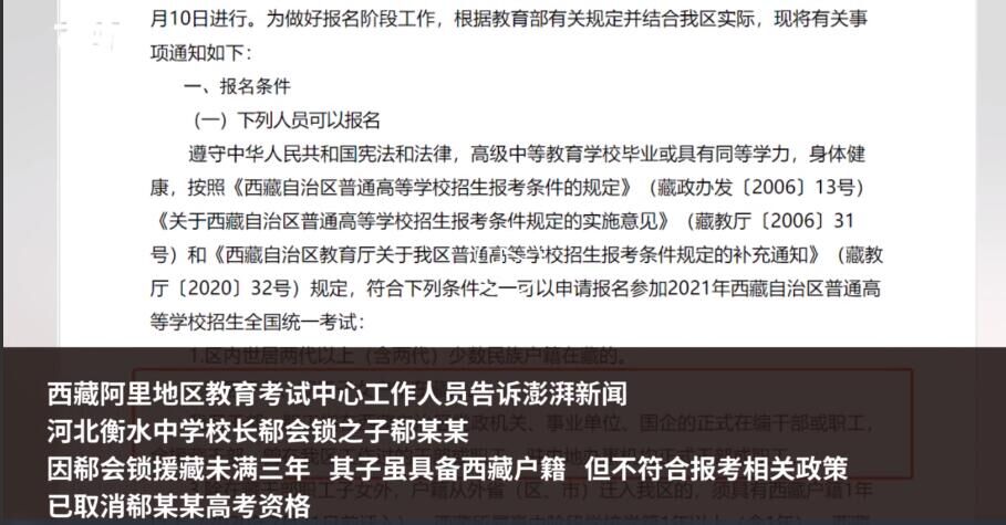 近日,有人发帖举报衡水中学校长郗会锁之子郗某某赴西藏报名高考,被指“高考移民”。本文记录此事件。