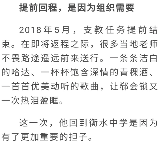 对此,衡水共青团,卓越名校学术联盟等官方微信公众号8月20日发布的一篇文章《衡水中学郗校长被网暴的前2000多天!》(不同公众号的文章标题有小差别,但内容相同)表示,该决定是出于“组织需要”。(下图为该文章部分截图)